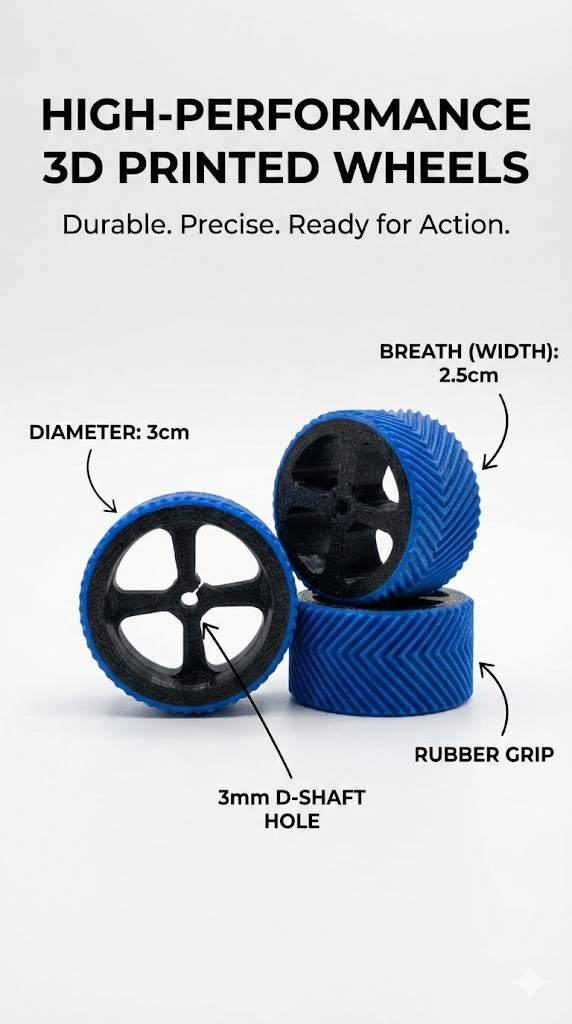 Superior Traction: The rubber grip with a herringbone pattern provides maximum surface area contact for better acceleration and braking. Perfect Fit: Specifically designed for N20 gear motors with a 3mm D-shaped shaft hole for a secure, non-slip fit. Optimized Dimensions: 3cm diameter for high speed and 2.5cm width for stability in robotics competitions. | Dyoraa Robotics.